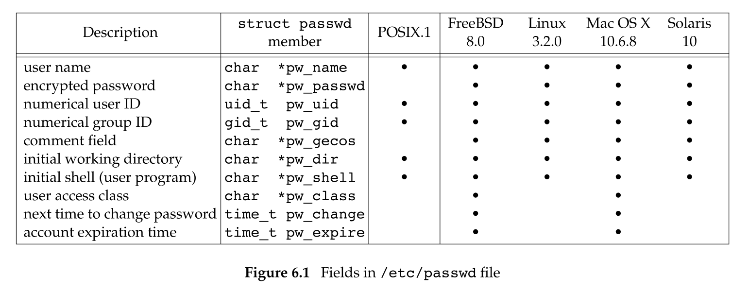 UNIX 系统口令文件 (POSIX 称为用户数据库) 包含以下字段,这些字段被包含在 <pwd.h> 中定义的 passwd 结构中: