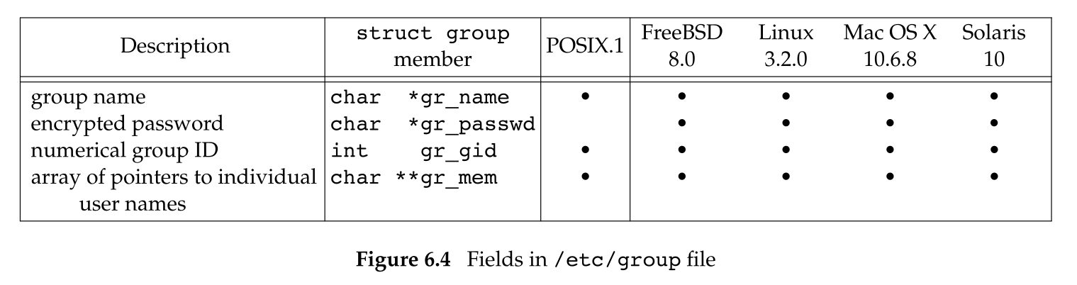 UNIX 组文件 (POSIX 称为组数据库) 包含下列字段,这些字段被包含在 <grp.h> 中的 group 结构中: