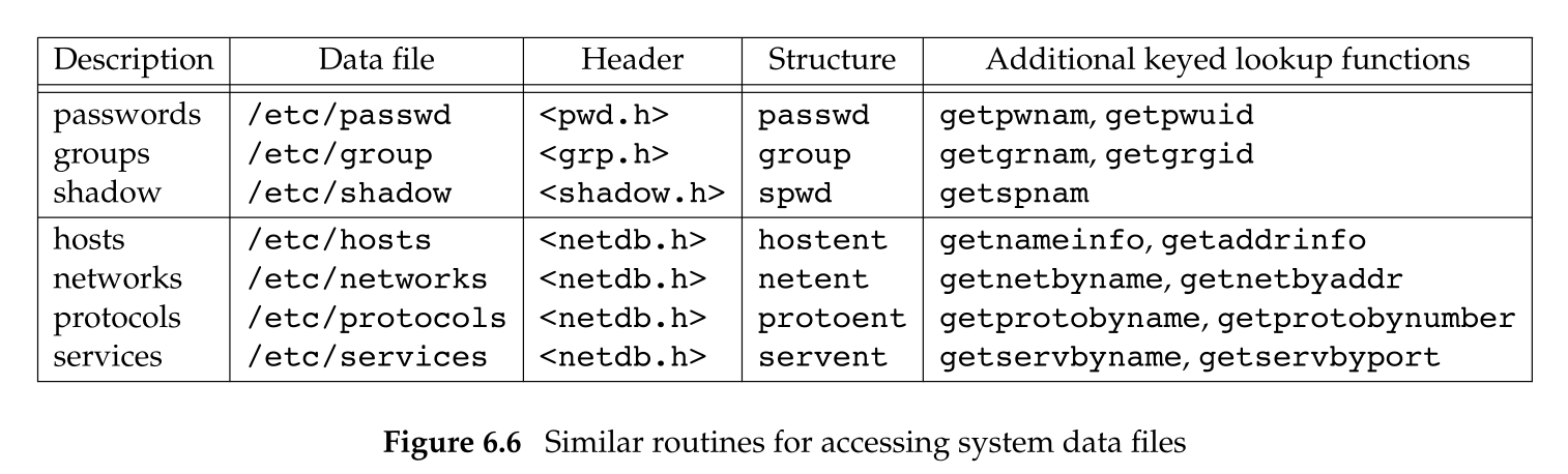 除了口令文件和组文件外,UNIX 系统还使用很多其他文件。一般情况下,对每个数据文件至少有 3 个函数: