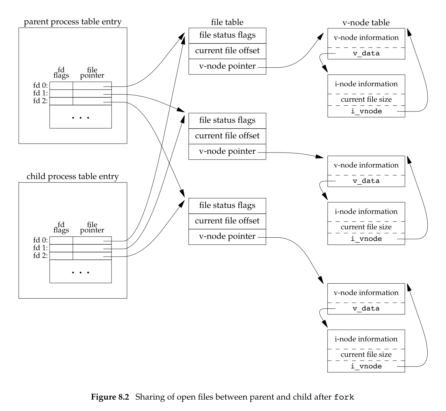 如果父子进程写入同一描述符指向的文件,但又没有任何形式的同步,那么它们的输出就会相互混合。