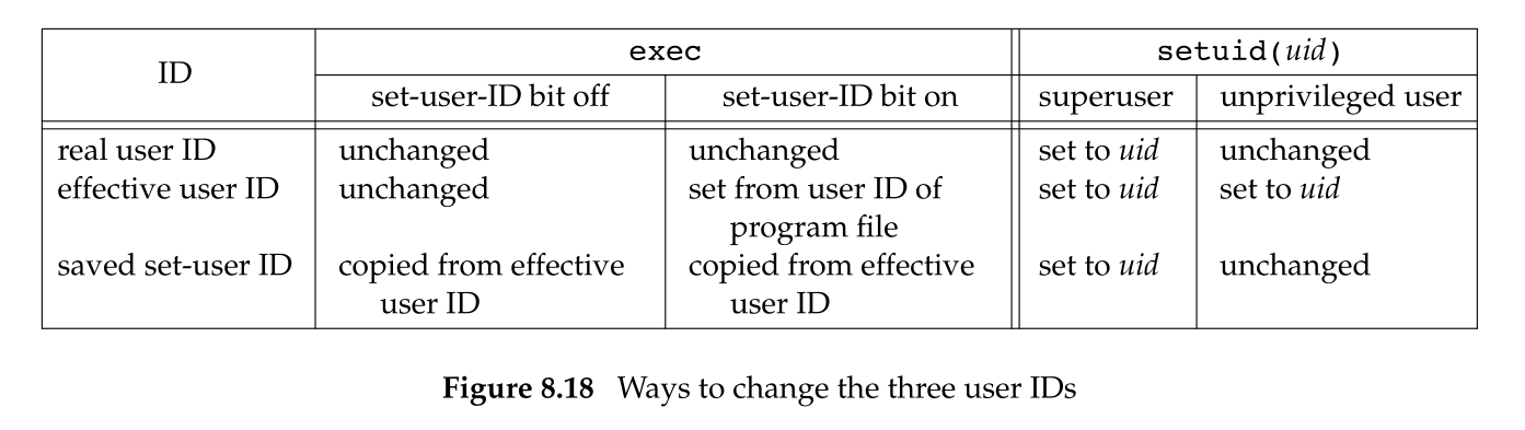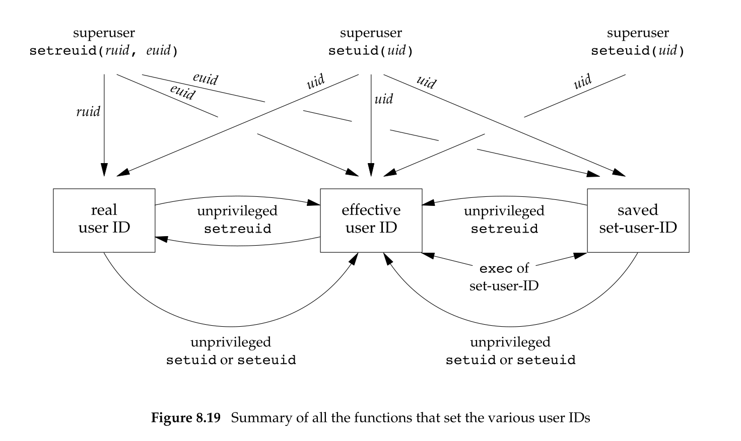 进程可以很容易的获取其实际用户 ID 和有效用户 ID。如果希望找到运行该程序用户的登录名,一种简单地做法是调用 getpwuid(getuid()),但是如果一个用户有多个登录名,这些登录名对应同一个用户 ID,则应该使用 getlogin 函数获得此登录名: