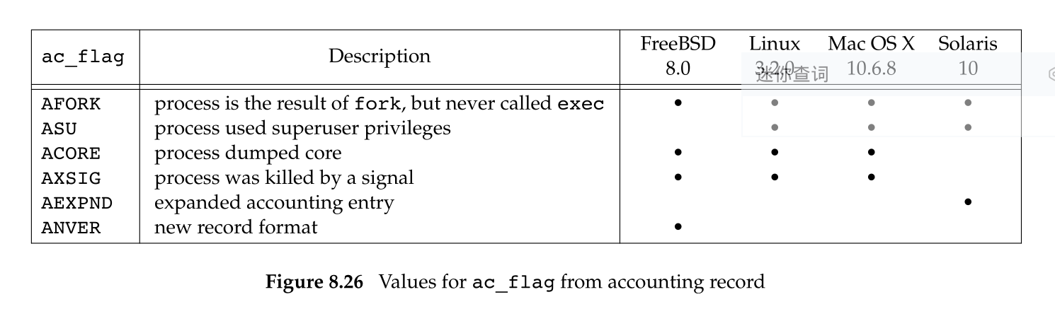 在大多数平台上,时间是以时钟滴答数记录的。成员 ac_flag 记录了进程执行期间的某些事件: