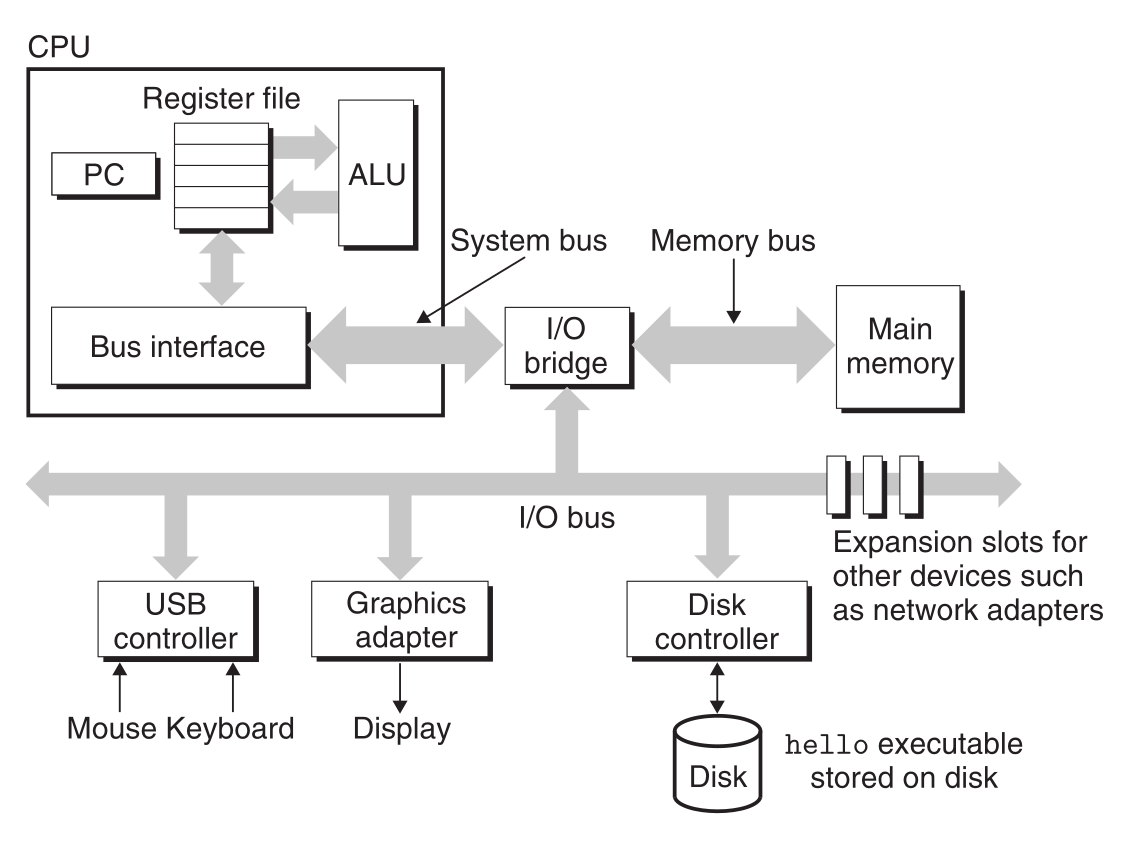 - 处理器:CPU 是解释 (执行) 存储在主存中指令的引擎。从系统通电开始,CPU 会一直执行