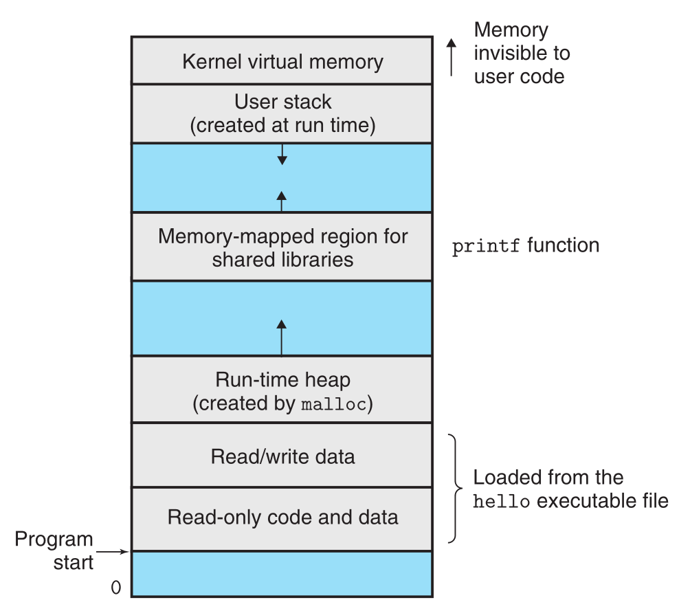 - 虚拟内存:虚拟内存是一个抽象概念,它为每个进程提供了一个假象,即每个进程都在独占的使用主存。每个进程看到的内存结构都是一致的,称为