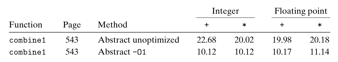 注意:combine3 和 combine4 的行为在某些情况时是不同的,如果 dest 指向的是数组的最后一个元素,那么二者得出的结果将不同。这也是编译器选择保守优化的原因,因为编译器无法判断内存别名使用的情况。