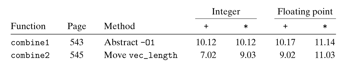 通常来说,过程调用会带来开销,而且妨碍大多数形式的程序优化。在 combine2 中,循环内每次都调用 get_vec_element 来获取当前元素。其中产生了函数调用以及边界检查的开销。