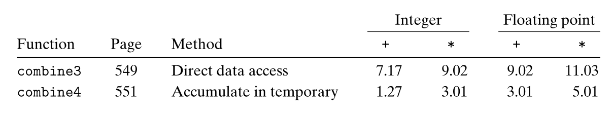 combine3 的代码将合并运算的计算结果累计在指针 dest 指定的位置中。反复的访问内存会降低程序的性能,一个解决方案是:引入一个临时变量,将计算结果存储在临时变量中,只在最后写入到内存中。