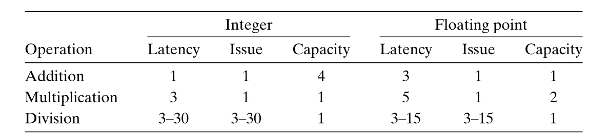 从整数运算到浮点运算,延迟是增加的。这种很短的发射时间是用流水线实现的,发射时间为 1 的功能单元称为完全流水线化:每个时钟周期可以开始一个新的运算。