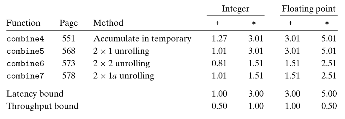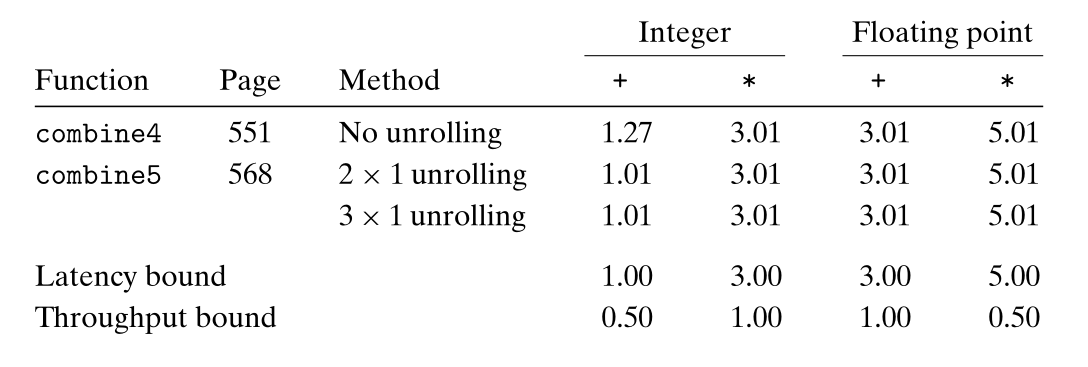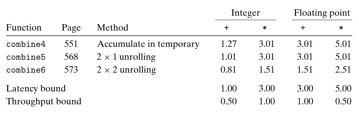 通常,只有保持能够执行该操作的所有功能单元的流水线都是满的,程序才能达到这个操作的吞吐量界限。对于延迟为 L,容量为 C 的操作而言,要求循环展开因子 k >= C * L。
